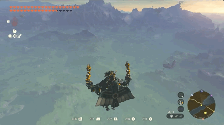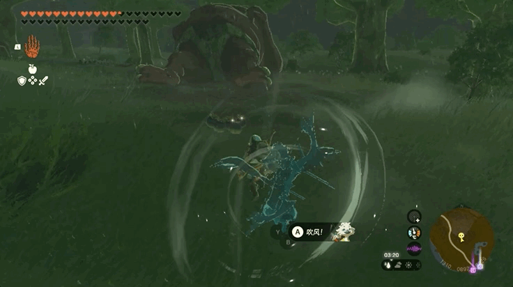 7.丘栗的吹风技能有个小bug可以被我们利用,国外玩家管这一招叫做Tulin Pumping(丘栗泵?):林克在滑翔过程中,让丘栗为自己吹风之后,如果连续按B取消滑翔再按X开始滑翔3次,林克的加速度就会得到保留,从而能以比正常滑翔速度更快的速度前行……如下图所示。