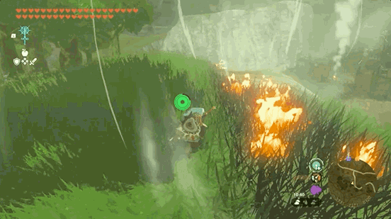 6.阿沅的攻击会在滚动路径上留下火焰,如果点燃了草丛等易燃物,就能为林克制造上升气流;同理,露珠的雷击也可以点燃草地。【你还在用打火石/火焰果点篝火吗?】