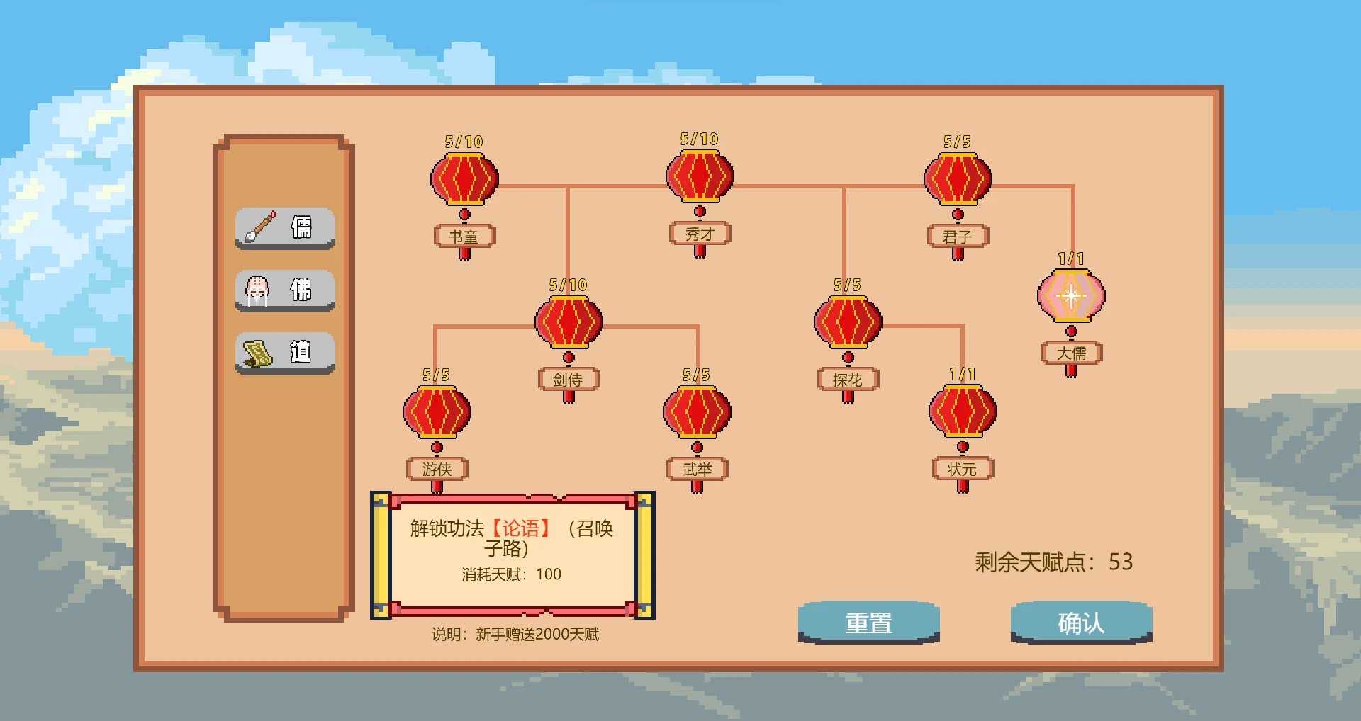 【天赋】是开局自带的增益。【天赋】在游戏开始界面进入,你可以花费天赋点来升级获得不同的加成,这里有三条分支,【儒】、【释】、【道】,三者分步加点,互不冲突,比如当你加点完【儒】的最后一个天赋【大儒】时,你可以获得一个强大的开局增益,功法【论语】,在战斗时召唤【子路】随从。升级所需花费的天赋点在第一次游玩时系统会赠送2000点,在西游模式不断闯关也会获得,你可以不断挑战这些关卡获取天赋点。