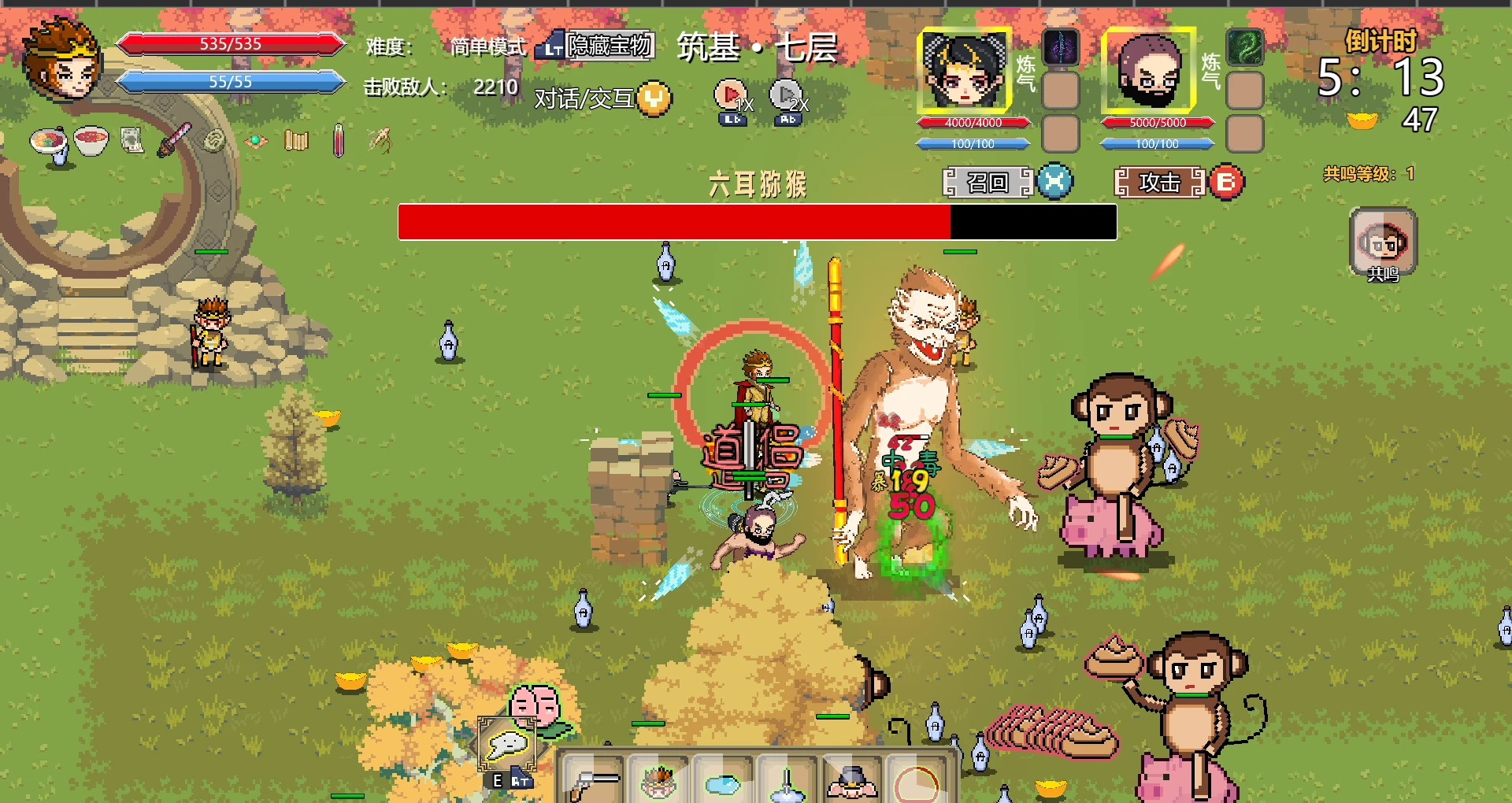 击败小怪后可能掉落【丹】、【元宝】,【丹】可以用于提高自身修炼等级,升级后可以从四种奖励中选择一项,用于提高自身战斗力,【元宝】可以用于各种交互,如每次获取升级奖励时的刷新奖励,还可以用于招募【道侣】。【道侣】是具有战斗能力的随从,招募道侣对战斗力有很大提升。