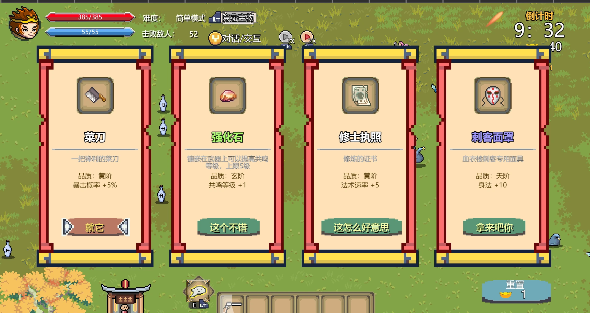 进入游戏后,你可以从四种增益宝物中任选一种,选取之后进入地图,开始作战。游戏中,人物会自动攻击从四面八方涌来的小怪,你的目的是在倒计时内生产下来并且不断打怪升级,最终打败关卡Boss取得胜利。你可以通过键盘按键【W】、【S】、【A】、【D】操纵人物移动,【E】键可以释放人物主动技能(需要消耗蓝量)。